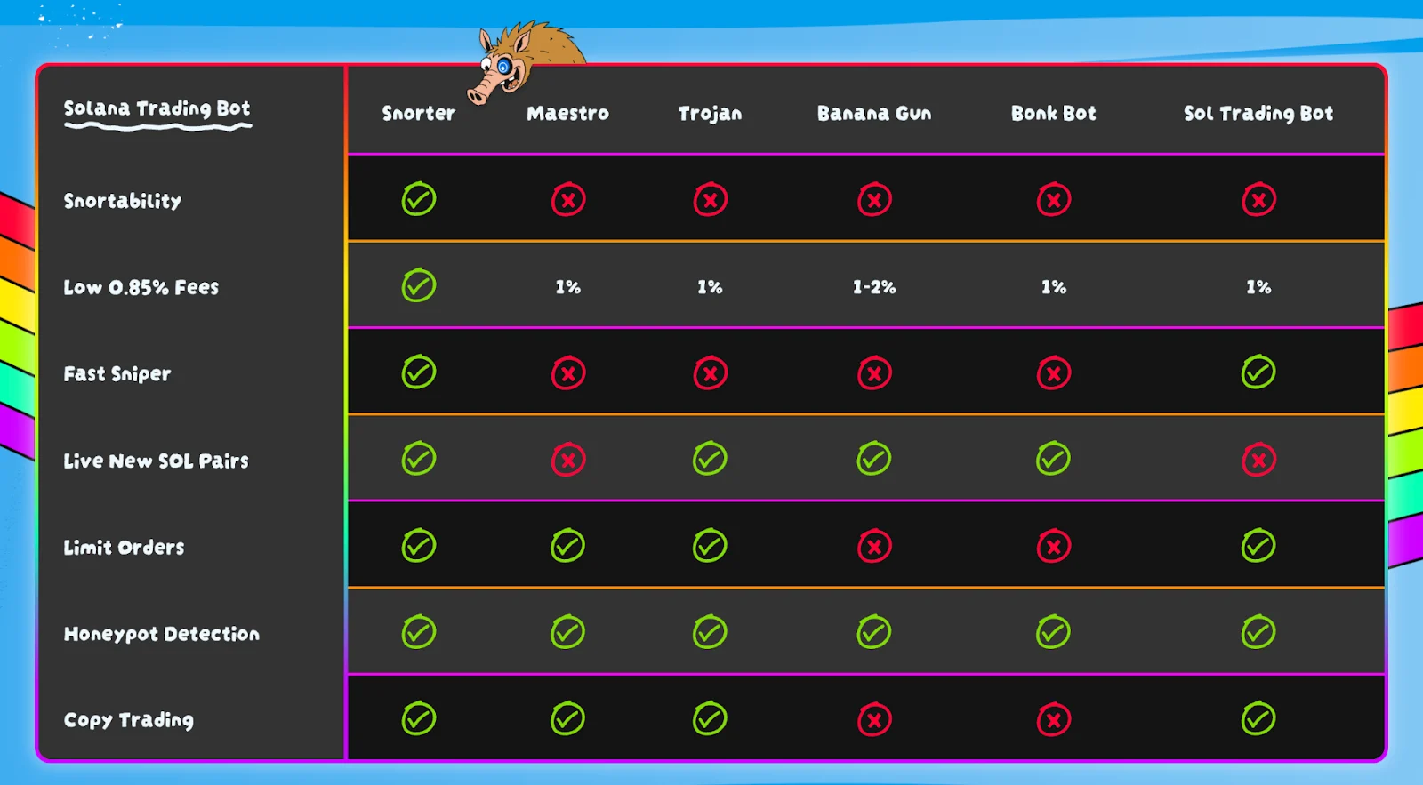 تجدر الإشارة أيضاً إلى أن عملة سنورتر (Snorter) تقدم أدوات تداول متطورةً، تشمل اقتناص العملات الجديدة، ونسخ إستراتيجيات التداول، واكتشاف ممارسات سحب البساط، وأوامر إيقاف الخسارة المرنة، والمزيد غير ذلك.