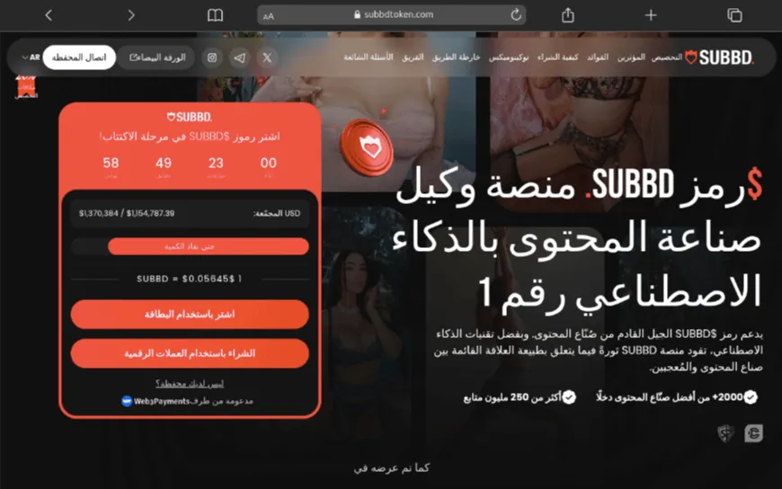 تجري الآن مرحلة البيع المسبق لرموز $SUBBD بسعر منخفض يبدأ من 0.055 دولار فقط، مع توقع نمو يصل إلى 11 ضعفًا بنهاية 2025. كما توفر المنصة عوائد سنوية ثابتة تبلغ 20% من خلال نظام التخزين (Staking)، إضافة إلى عقود ذكية مُدققة أمنيًا، وعدد رموز محدود بمليار فقط، مما يعزز ندرة الأصل وقيمته.
