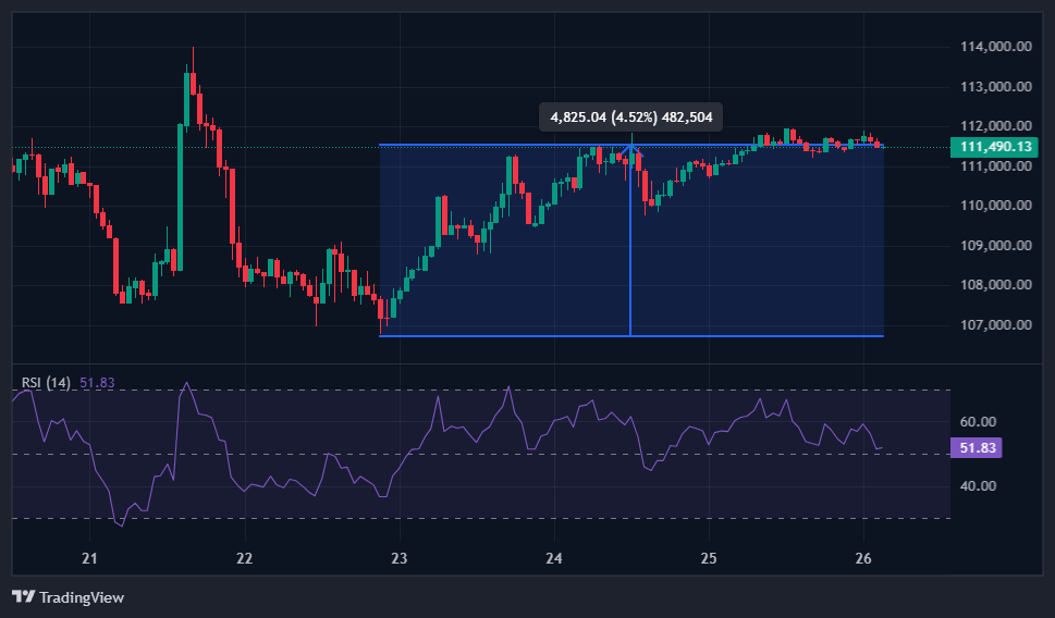وخلال الساعات الأربع والعشرين الماضية، ارتفع سعر عملة بيتكوين (Bitcoin) بنسبة متواضعةٍ بلغت 0.35% فقط، ما يشير إلى أداء محدود لا يحمل تغييراتٍ كبيرة، وتُظهر بيانات التداول على الإطار الزمني الساعي إلى استقرار نسبيّ حول مستوى 111,000$ عقبَ ارتفاع سابق بنسبة 4.5% منذ 23 أكتوبر، كما يقف مؤشر القوة النسبية (RSI) عند 51، ما يعكس استمرار حالة الركود النسبي في حركة السعر.