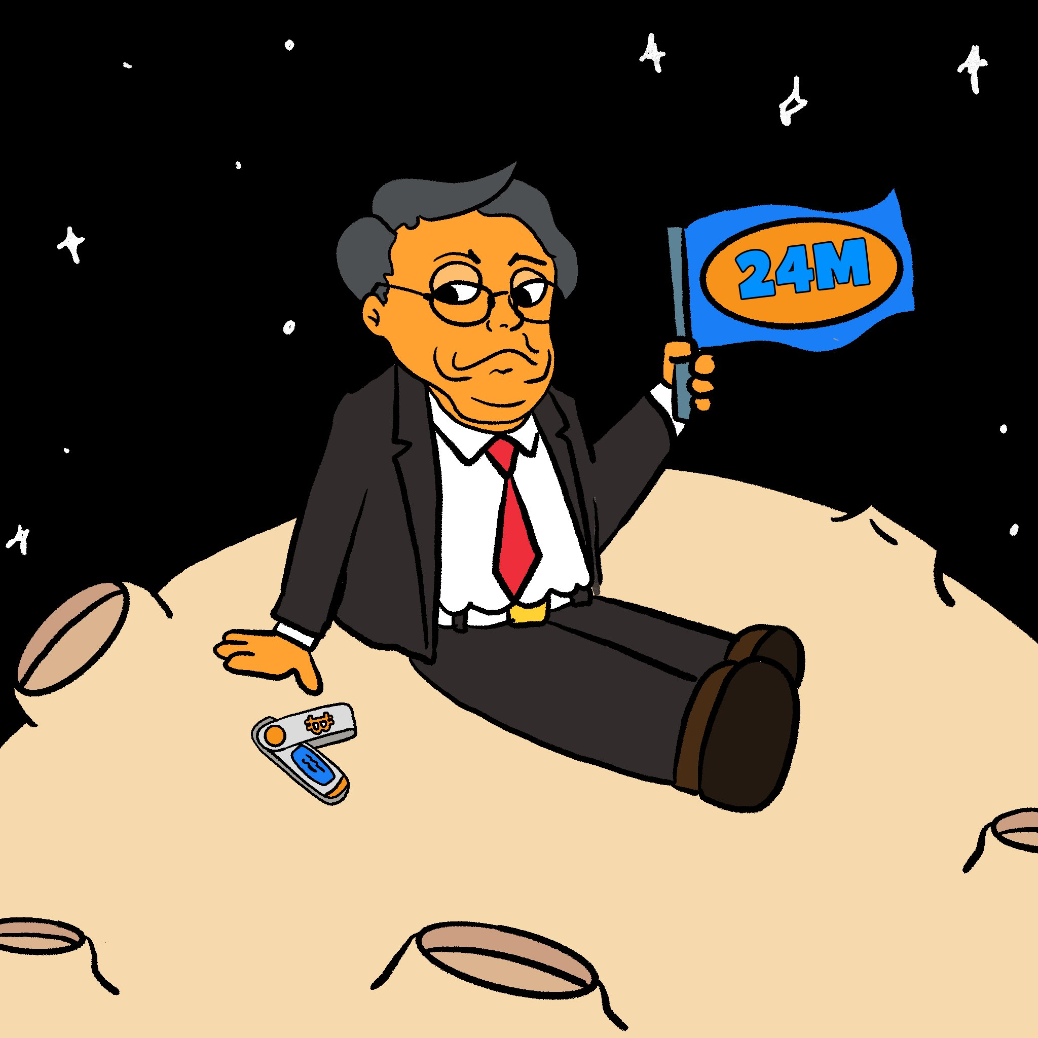 شخصية كرتونية للمحلل توم لي جالساً على سطح القمر ويحمل راية كتب عليها 24 مليون