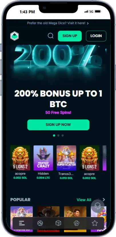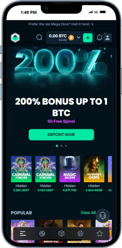 يتمتع Mega Dice بواجهة سلسة، دعم عملات متعددة بما في ذلك عملته الخاصة $DICE، مع تركيز واضح على ألعاب السلوتس وألعاب الطاولة.