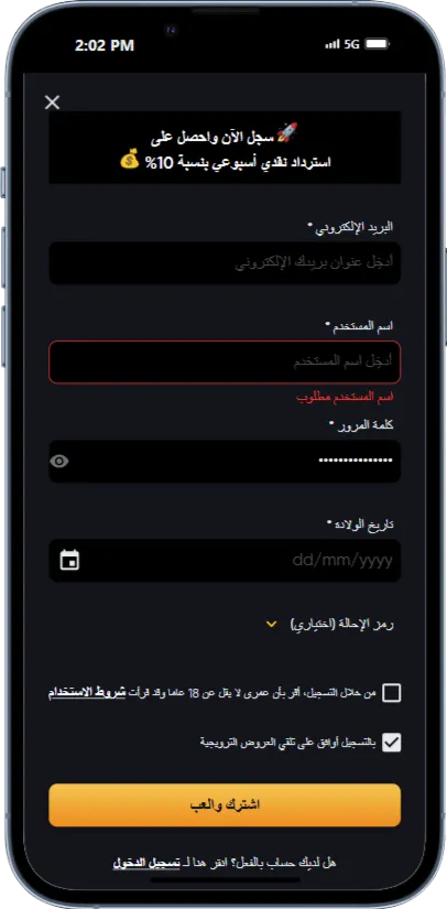 بعد ذلك قم بتقديم معلوماتك الشخصية، بما في ذلك عنوان بريد إلكتروني صالح، تاريخ ولادة، مع اقتراح اسم مستخدم وعبارة مرور قوية. تأكد من الموافقة على شروط الاستخدام من خلال النقر على الصندوق المناسب قبل الضغط على خيار “اشترك والعب”.