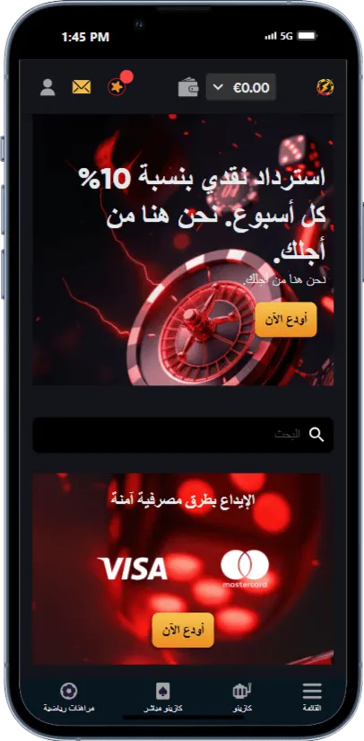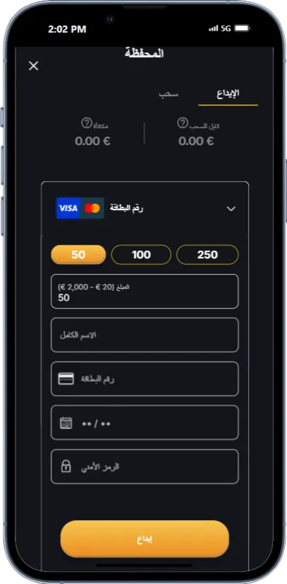 بعد إنشاء حسابك الخاص وتسجيل الدخول على منصة الكازينو، ستكون مُطالبًا بإجراء إيداع أولي للتأهل لِجني المكافآت. للقيام بالمعاملات المالية، انقر على أيقونة المحفظة في أعلى الصفحة الرئيسية، أو انقر بكل بساطة على زر الإيداع الذي يظهر على شاشتك.
