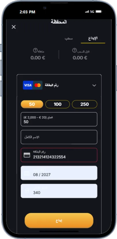 قم بتقديم معطياتك المالية. إذا كنت تستخدم بطاقة الائتمان، قم بتقديم رقم البطاقة، تاريخ الصلاحية، الرمز الأمني، إضافة إلى اسمك الكامل أو اسم صاحب البطاقة، ثم حدد قيمة الإيداع. تأكد دائمًا من الاطلاع على شروط وأحكام المكافأة، وذلك للالتزام بالحد الأدنى للإيداع المنصوص عليه، والذي يتراوح بين 10 و20 دولارًا حسب منصة الكازينو.