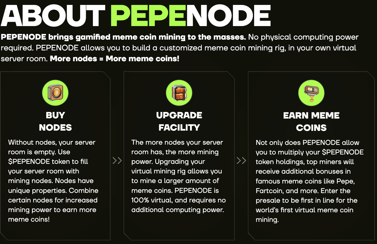 كذلك، تكمُن أهمية مشروع عملة بيبي نود (PepeNode) في سعيه إلى سد الفجوة بين قطاعي الألعاب وتعدين العملات الرقمية، ليُحوّل ما كان في السابق عملية تقنية إلى تجربةٍ مجتمعية تفاعلية، يُوضح فيها كيف يمكن أن تتمتّع العملات الجديدة برواج بالغ حتى قبل إطلاقها في السوق المفتوحة.